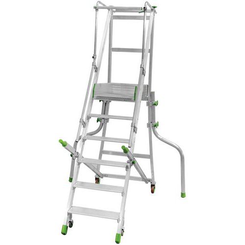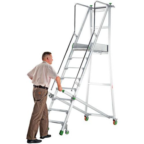 Plataforma móvil ergonómica fácil de mover gracias a los mangos plegables. Ángulo de subida de 60° para un uso fácil y protegido. Comodidad y seguridad con plataforma de chapa de diamante. Peldaños grandes y amplios, antideslizantes. Plataforma con portaherramientas desmontable. Escalera plegable fácil de guardar. La barra de seguridad de la barandilla se acciona mediante una palanca y se abre verticalmente.