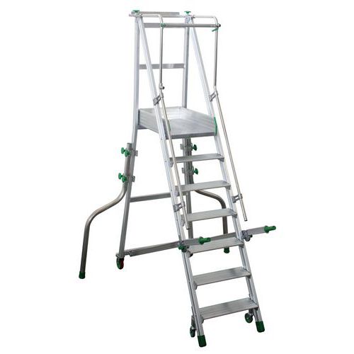 Plataforma móvil ergonómica fácil de mover gracias a los mangos plegables. Ángulo de subida de 60° para un uso fácil y protegido. Comodidad y seguridad con plataforma de chapa de diamante. Peldaños grandes y amplios, antideslizantes. Plataforma con portaherramientas desmontable. Escalera plegable fácil de guardar. La barra de seguridad de la barandilla se acciona mediante una palanca y se abre verticalmente.