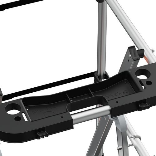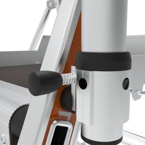 Plataforma móvil Veloce. Barandilla rígida en los 3 lados con correas de protección anticaídas traseras. Ruedas escamoteables para un desplazamiento rápido y óptimo. Peldaños antideslizantes de 80 mm. Compartimento portaherramientas extraíble, con resistencia hasta 25 kg y ganchos integrados (máx. 10 kg). Suelo antideslizante de madera de origen ecológico de 500 x 400 mm. Espacio de trabajo ergonómico. Estabilizadores retráctiles con ajuste milimétrico.