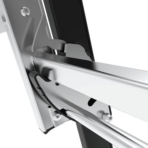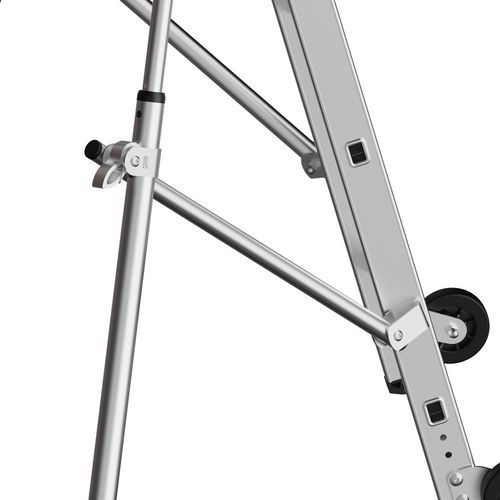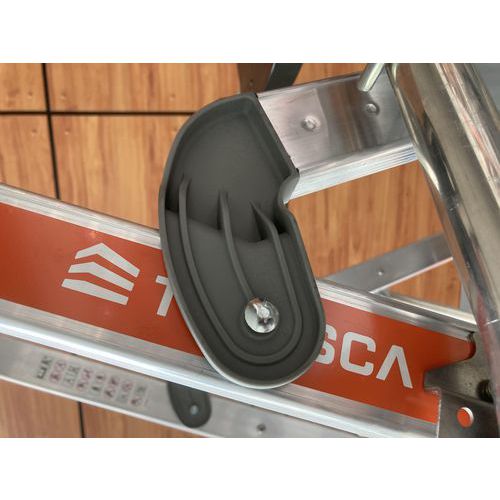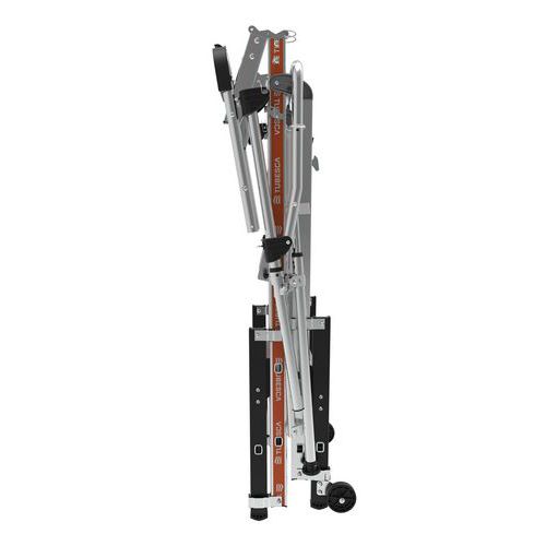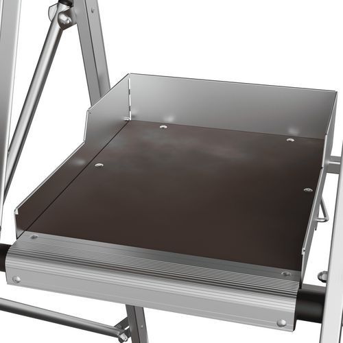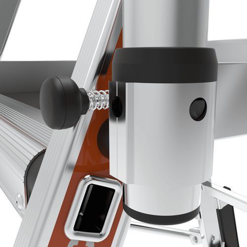 Barandilla plegable para un tamaño extremadamente compacto y facilidad de transporte y almacenamiento. Peldaños antideslizantes de 80 mm (superficie fija) y 60 mm (superficie telescópica). Compartimento portaherramientas extraíble, resistencia hasta 25 kg y ganchos integrados (máx. 10 kg). Estante XL con resistencia hasta 25 kg. Superficies telescópicas que permiten el cambio de nivel. Sistema de ajuste de altura intuitivo y seguro con ajuste cada 23 cm. Suelo antideslizante de madera de origen ecológico de 500 x 400 mm con cierre automático. Espacio de trabajo ergonómico. Estabilizadores retráctiles con ajuste milimétrico. Ruedas de desplazamiento Ø 100 mm (3/4 pasos).