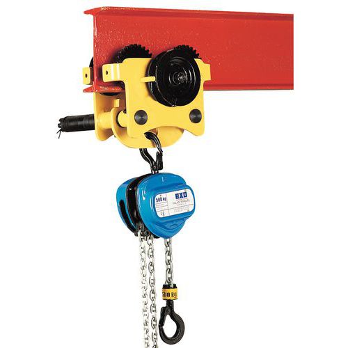 Polipasto manual fabricado completamente en acero que ofrece la mayor solidez y seguridad y ocupa muy poco espacio. Triple engranaje bajo las carcasas, muy resistentes a los choques. Mecanismo montado sobre rodamientos de agujas con guía de cadena envolvente para un funcionamiento sin fallos. Freno automático sin amianto que garantiza la parada instantánea de la carga en cuanto deja de haber tracción sobre la cadena de maniobra. Engrasado de los asientos garantizado para varios años de funcionamiento y una mayor vida útil. Cadena de elevación muy resistente con tratamiento contra la corrosión. Polipasto (coeficiente de seguridad 5) equipado con un sistema de fin de recorrido mecánico en movimiento descendente y con un freno de doble trinquete para una seguridad óptima. Adecuado para todas las vigas con perfiles IPN, IPE, HEA y HEB.
