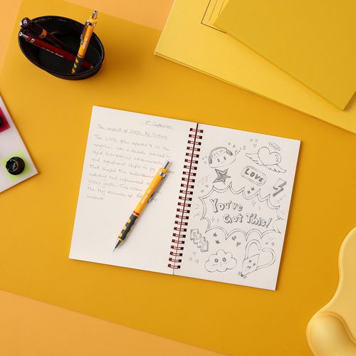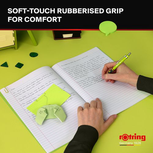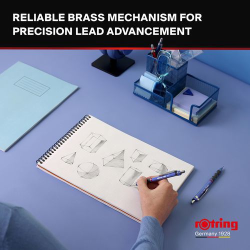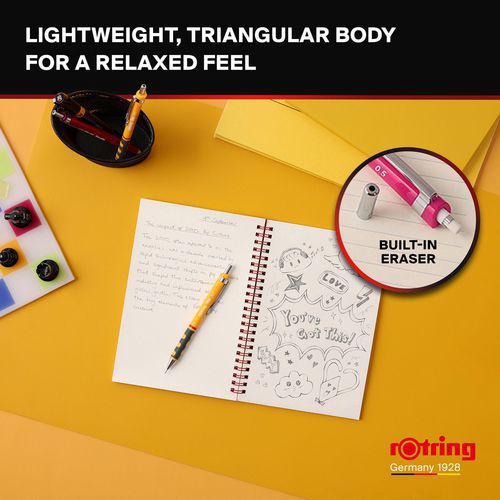 Portaminas HB 0,7 mm Rotring Tikky Collection, ligero con empuñadura de goma suave al tacto para una escritura excepcionalmente cómoda. Recargable, con minas HB de alto polímero, mecanismo de latón para un avance preciso de la mina. El manguito guía fijo de la mina evita roturas y proporciona una visión clara de la página para dibujar con precisión con una regla. El cuerpo triangular especialmente diseñado no resbala en las mesas inclinadas. Empuñadura de goma suave al tacto para mayor comodidad, con un borrador integrado bajo la tapa del pulsador.