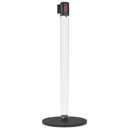 Poste con correa y tubo transparente. Solución práctica y fácil de usar. Posibilidad de conectar 4 correas gracias a los 4 puertos disponibles. Poste transparente para una mayor discreción.