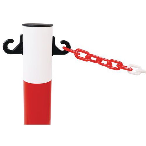 Poste para cadenas muy resistente provisto de 4 ganchos en 2 niveles para enganchar las cadenas. Muy útil para señalar una prohibición temporal. Provisto de una base cuadrada muy estable.