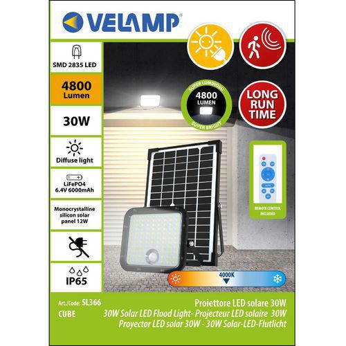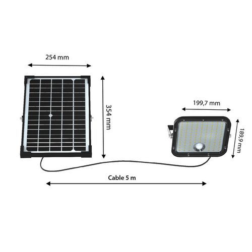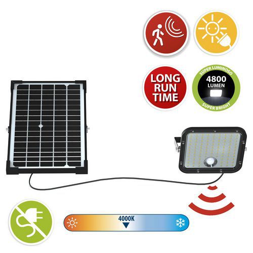 | Nombre del producto | Proyector LED solar con detector de movimiento + panel, Flujo luminoso: 4800 lm, Potencia: 30 W |