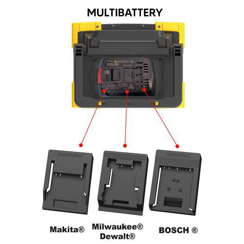 La linterna de trabajo incluye 3 adaptadores para su uso con las siguientes 4 marcas de baterías: Bosch, Dewalt, Makita y Milwaukee.