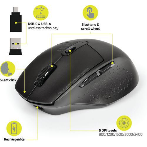 | Nombre del producto | Ratón ergonómico inalámbrico y recargable Pro Bluetooth ambidiestro, Tipo de sensor: Óptico |