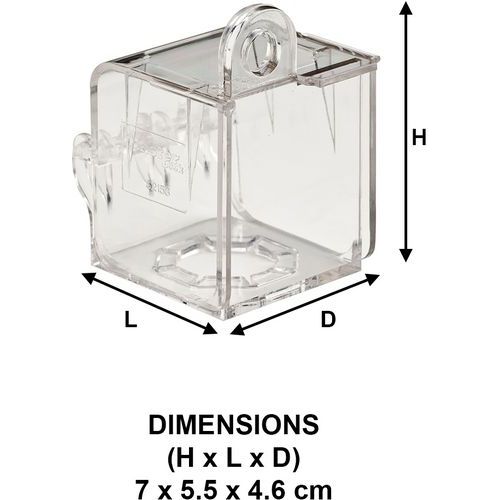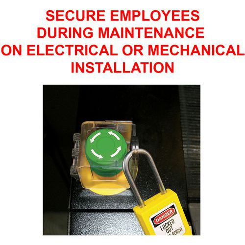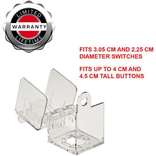 El dispositivo se sujeta a la corona del interruptor giratorio o pulsador y tiene una base y tapa transparentes para permitir la visibilidad de placas de identificación y etiquetas.