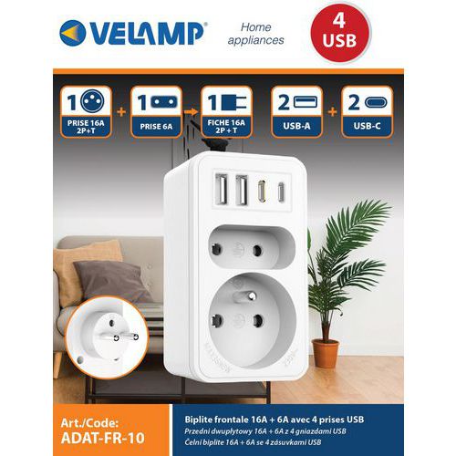La Velamp biplite ofrece 2 tomas eléctricas + 4 tomas USB.