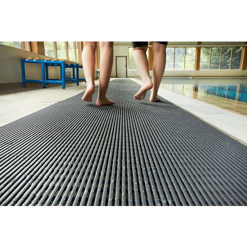Metro lineal de rejilla antideslizante para zonas comunes. Higiénica gracias al material no poroso y a los aditivos antimicrobianos y antimicóticos. Diseño innovador para un drenaje ultraeficaz del agua. Rejilla fácil de cortar, instalar y retirar. Relieve antideslizante para una excelente estabilidad.