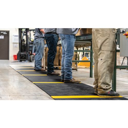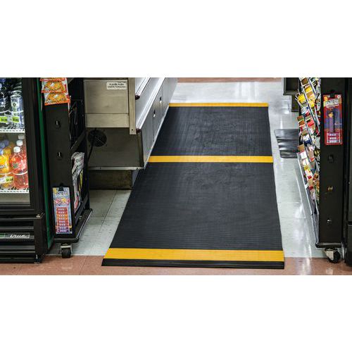 Alfombra de rejilla de PVC suave, negra con tiras de posicionamiento alternas en amarillo para respetar la distancia social. Excelente absorción acústica, muy cómoda para estar de pie al recubrir las irregularidades del suelo. Fabricada en PVC no poroso que ofrece resistencia natural al crecimiento de bacterias. Construcción cruzada de 2 capas con rejilla de PVC abierta para un excelente drenaje de líquidos. Limpieza fácil: se puede levantar o enrollar para limpiarla con mangueras de agua a presión. Asegúrese de que sus visitantes, clientes y empleados respetan cómodamente la distancia de seguridad