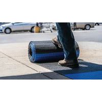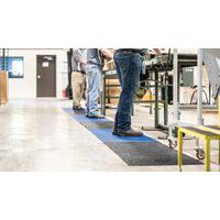 Rejilla de PVC flexible, negra con tiras de posicionamiento alternas en azul para respetar la distancia social. Excelente absorción acústica, muy cómoda para estar de pie al recubrir las irregularidades del suelo. Estructura de la rejilla calada, con un diseño de la rejilla sencillo y ligero para un drenaje de líquidos excelente. Fabricada en PVC no poroso que ofrece resistencia natural al crecimiento de bacterias. Limpieza sencilla: se puede levantar o enrollar para limpiarla con mangueras de agua a presión. Alfombra de rejilla fácil de instalar con colocación libre, sin necesidad de accesorios para un fácil movimiento.