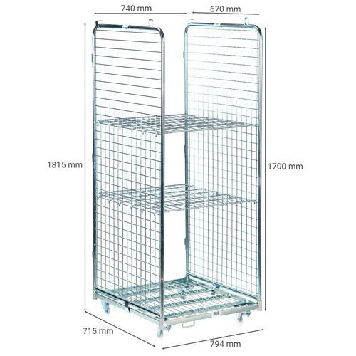 | Nombre del producto | Roll-contenedor 2 lados y 2 baldas, Carga: 400 kg, Altura total: 1815 mm, Longitud total: 794 mm |