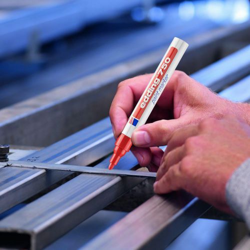 Marcador pintura - Edding 750 para una escritura de gran recubrimiento y permanente incluso en materiales oscuros y transparentes. Marcado sobre el metal, vidrio, plástico etc. y en particular, todas las superficies lisas. Secado rápido de la pintura, poco olor. Resistente al agua, a la luz, al calor de hasta 400 °C (1000 °C para algunos colores como blanco, amarillo, plata) y resistente a la abrasión. Válvula que regula el flujo de tinta. Sin tolueno/xileno.