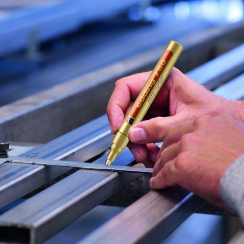 Marcador pintura - Edding 750 para una escritura de gran recubrimiento y permanente incluso en materiales oscuros y transparentes. Marcado sobre el metal, vidrio, plástico etc. y en particular, todas las superficies lisas. Secado rápido de la pintura, poco olor. Resistente al agua, a la luz, al calor de hasta 400 °C (1000 °C para algunos colores como blanco, amarillo, plata) y resistente a la abrasión. Válvula que regula el flujo de tinta. Sin tolueno/xileno.