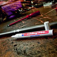 Marcador pintura - Edding 750 para una escritura de gran recubrimiento y permanente incluso en materiales oscuros y transparentes. Marcado sobre el metal, vidrio, plástico etc. y en particular, todas las superficies lisas. Secado rápido de la pintura, poco olor. Resistente al agua, a la luz, al calor de hasta 400 °C (1000 °C para algunos colores como blanco, amarillo, plata) y resistente a la abrasión. Válvula que regula el flujo de tinta. Sin tolueno/xileno.