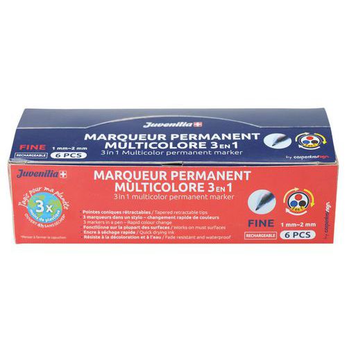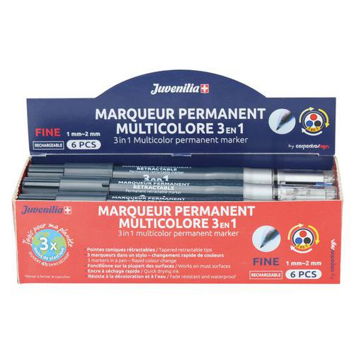 | Nombre del producto | Rotulador permanente de 3 colores con punta recargable, Tinta color: Surtido, Material cuerpo: PVC |