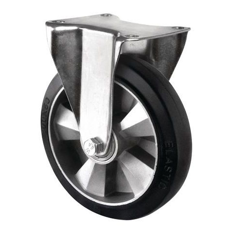 - Rueda pivotante resistente a golpes y vibraciones mediante banda de rodadura de caucho.