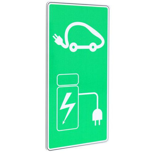 Ideal para aparcamientos y entornos exteriores, para señalizar las zonas de recarga. Su diseño en aluminio ofrece una buena resistencia a la corrosión, lo que garantiza una larga vida útil. Resiste la humedad y las limpiezas periódicas, por lo que es apto para el uso diario. El contraste entre el pictograma del coche eléctrico y el fondo verde permite una lectura rápida, incluso a distancia. Garantiza una señalización clara para organizar los espacios destinados a los vehículos eléctricos.