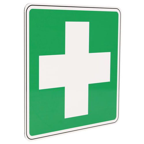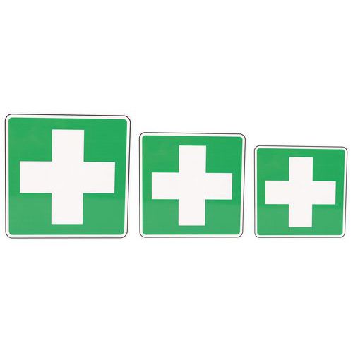 - Pictograma con el símbolo de primeros auxilios para localizar rápidamente los equipos de emergencia.