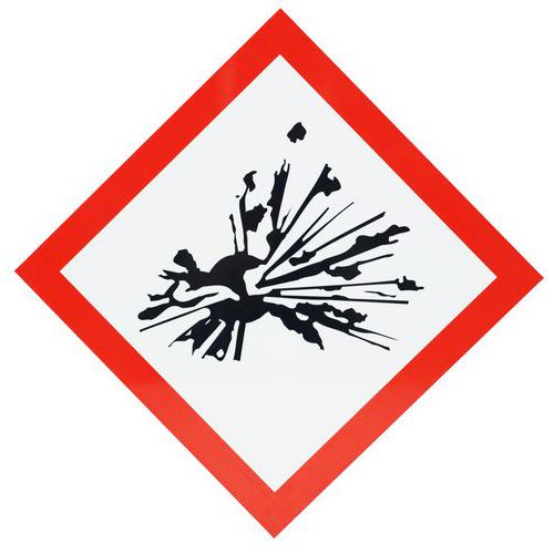 - Panel cuadrado con pictograma de materiales explosivos para indicar la presencia de productos que pueden explotar en contacto con una llama, electricidad estática o bajo el efecto de un impacto.
