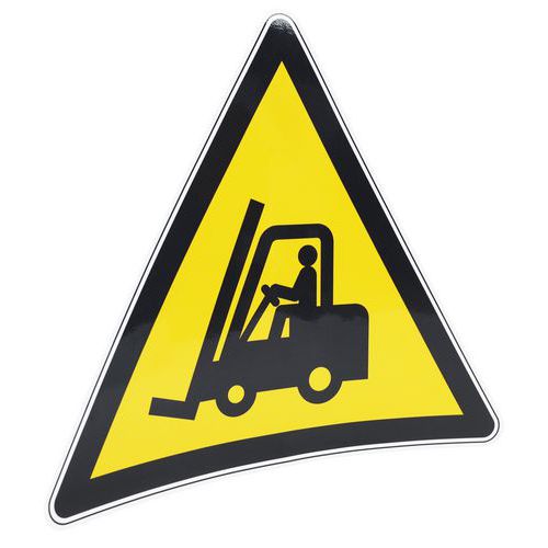 Esta señal indica el peligro que puede causar el tráfico de vehículos industriales, como carretillas elevadoras o equipos de manipulación. Señal redonda. Utilice esta señal con pictograma para indicar la circulación de este tipo de vehículos. Podrá reducir directamente el riesgo de accidentes causados por una mala gestión de las zonas de circulación de peatones y vehículos en sus almacenes. Para pegar en cualquier superficie lisa, desengrasada y limpia.
