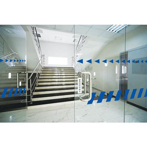 Señalización puerta vidrio, Modelo: Flecha, Altura: 52 mm, Fondo color: Transparente, Carácter color: Azul Señalización puerta vidrio, Modelo: Flecha, Altura: 52 mm, Fondo color: Transparente, Carácter color: Azul