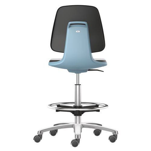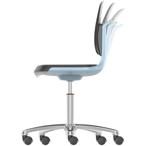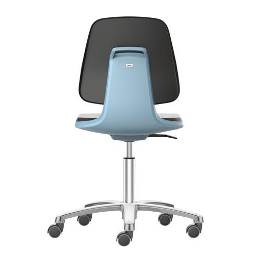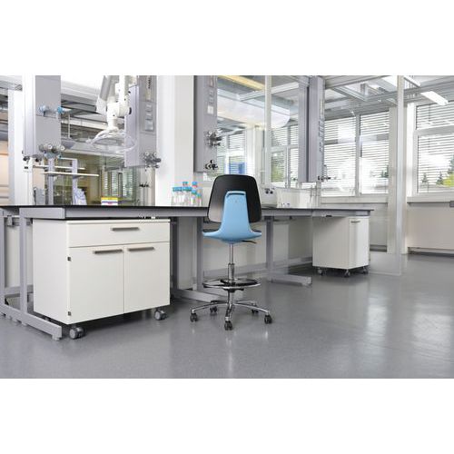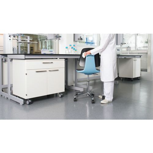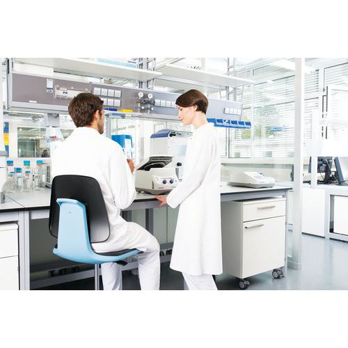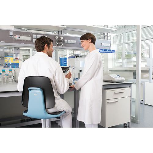 Silla de taller apta para salas blancas. Innovadoras funciones ergonómicas: Sigue todos los movimientos del cuerpo. Funcionalidad 3D-Flex en el asiento y en el respaldo. Manejo sencillo gracias a sus asas integradas. Perfecta para su laboratorio. Se puede lavar y es resistente a los desinfectantes.