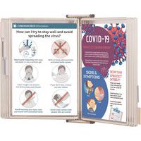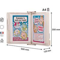 Kit de pared antimicrobiano con pivote para colocar documentos de forma higiénica. Funda de producto orgánico y natural, con iones de plata, que detiene gérmenes y bacterias. Soporte de pared con cuatro conectores para mantener las fundas y cinco grapas para indexar. Con 10 fundas pivotantes de PVC Sterifold antibacterianas con pivotes metálicos.