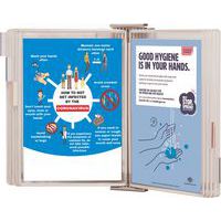 Kit de pared antimicrobiano con pivote para colocar documentos de forma higiénica. Funda de producto orgánico y natural, con iones de plata, que detiene gérmenes y bacterias. Soporte de pared con cuatro conectores para mantener las fundas y cinco grapas para indexar. Con 10 fundas pivotantes de PVC Sterifold antibacterianas con pivotes metálicos.