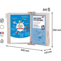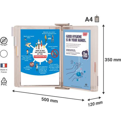 Kit de pared antimicrobiano con pivote para colocar documentos de forma higiénica. Funda de producto orgánico y natural, con iones de plata, que detiene gérmenes y bacterias. Soporte de pared con cuatro conectores para mantener las fundas y cinco grapas para indexar. Con 10 fundas pivotantes de PVC Sterifold antibacterianas con pivotes metálicos. Fabricado en la UE Garantía al cliente : 2 años