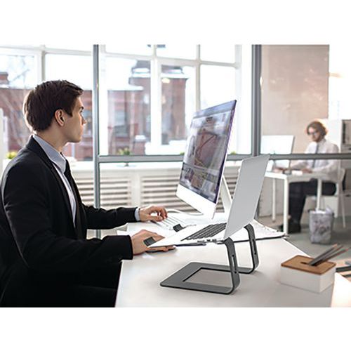 Soporte ergonómico de aluminio especial para portátiles con estructura abierta, gran ventilación. La posición elevada de los ojos reduce el dolor de cuello y espalda. Diseño ergonómico con pasos de cable que optimizan el espacio de trabajo. Los ganchos de seguridad y los patines antideslizantes evitan que el dispositivo se caiga. Cuerpo integral de aluminio y silicona para una máxima resistencia. Soporte estructural totalmente extraíble para una fácil instalación.