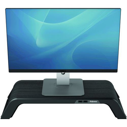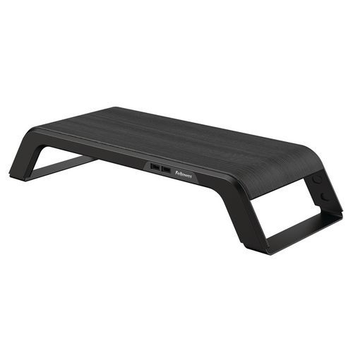 Soporte de monitor minimalista y elegante con conectividad USB.