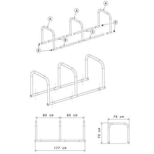 | Nombre del producto | Soporte para bicicletas arco, Longitud total: 1770 mm, Nº de plazas: 6, Material: Acero, Acabado: Galvanizado |