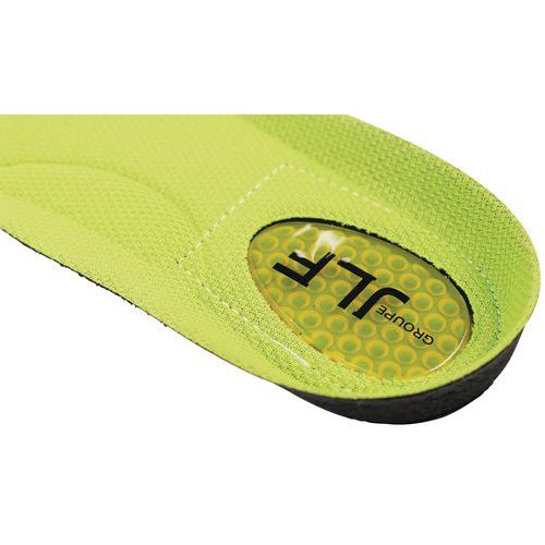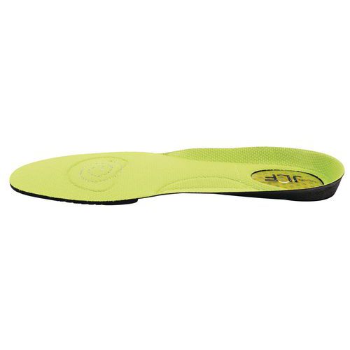 Suela termoformada anatómica para una sujeción óptima del pie Capsula de gel para absorber los impactos al nivel del talón. Tratamiento S3F® que evita el desarrollo de bacterias y hongos responsables de micosis. Suela transpirable que aporta comodidad gracias a una buena absorción de la transpiración. Antiestáticas.
