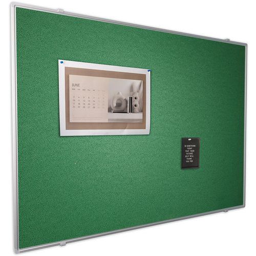 Tablón de visualización textil para fijar con chinchetas Superficie de alta calidad 100 % reciclada. Gran gama de colores para el fondo. Material de aluminio anodizado de calidad. Contorno anodizado con perfiles y esquinas de plástico. Mantenimiento fácil. Resistente al fuego.