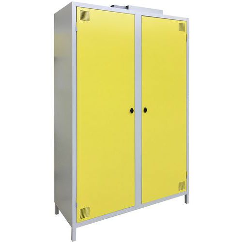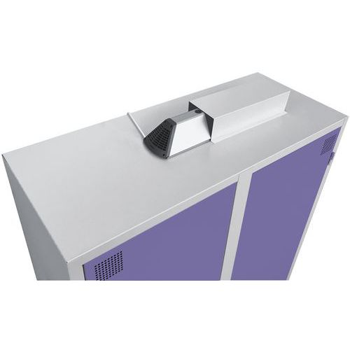 Taquilla de desinfección rápida, eficaz y económica con tecnología de ozono. Balda con numerosas perforaciones para libre circulación y ventilación adecuada del ozono. Taquillas con tapa de protección y testigo de funcionamiento de Air Care. Producto diseñado y fabricado en Francia. Solución Ozone: Desinfección total en tiempo récord de las prendas y herramientas.