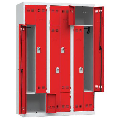Taquilla para ahorro de espacio en L, 1 a 3 columnas. Permite a cada usuario de disfrutar de un casillero de almacenamiento y de una percha. Espacio de almacenamiento utilizable en su máxima capacidad. Consejos de seguridad: - Instalar el mueble sobre una superficie plana - Fijarlo a la pared o a un tabique con una fijación adecuada - Verificar que no se supera la carga máxima aconsejada y que se mantiene una buena distribución