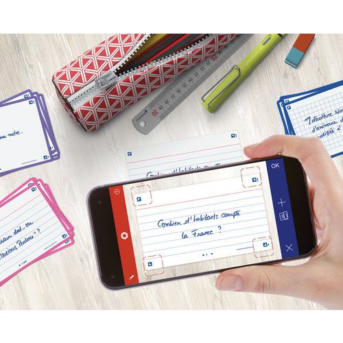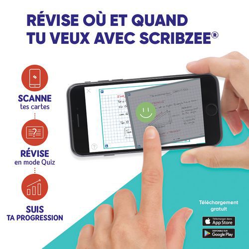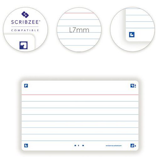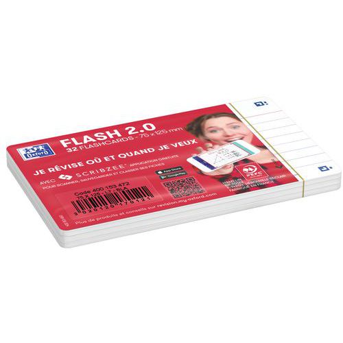Tarjetas Bristol Flash 2.0 75x125 mm con líneas, para repaso. Escriba una pregunta en el anverso y la respuesta en el reverso de sus tarjetas Flash 2.0. Utilice el método pregunta/respuesta para memorizar la mayor cantidad de información posible. Compruebe sus conocimientos con regularidad para reactivar su memoria y asimilarlos a largo plazo. Scribzee® es una aplicación gratuita para escanear, guardar y organizar sus tarjetas Flash 2.0. Gracias a un marco de colores para cada tema, podrá clasificar y localizar sus tarjetas por temas o materias.