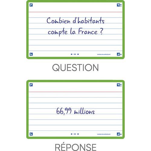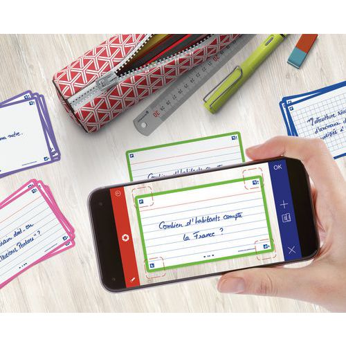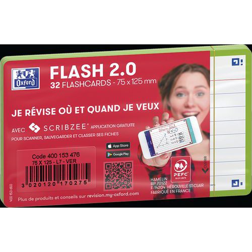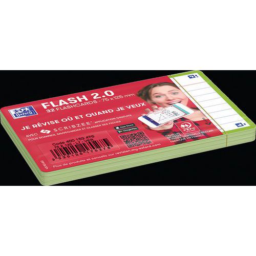 Tarjetas Bristol Flash 2.0 75x125 mm con líneas, para repaso. Escriba una pregunta en el anverso y la respuesta en el reverso de sus tarjetas Flash 2.0. Utilice el método pregunta/respuesta para memorizar la mayor cantidad de información posible. Compruebe sus conocimientos con regularidad para reactivar su memoria y asimilarlos a largo plazo. Scribzee® es una aplicación gratuita para escanear, guardar y organizar sus tarjetas Flash 2.0. Gracias a un marco de colores para cada tema, podrá clasificar y localizar sus tarjetas por temas o materias.