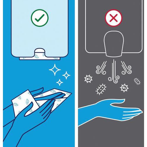 Toallitas de papel extrasuaves que proporcionan confort y una sensación agradable para las manos. Calidad QuickDry: más resistente y absorbente que el papel normal. Dispensación hoja a hoja para un consumo controlado y una mayor higiene. Apto para contactos alimenticios cortos, Toallas de papel acolchado y con motivos. Para un secado higiénico de las manos en entornos exigentes en materia de confort e higiene