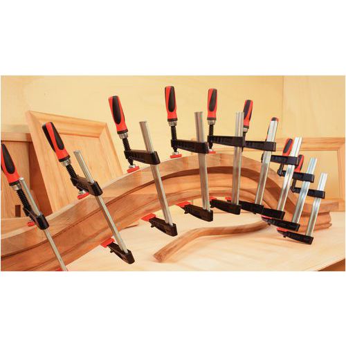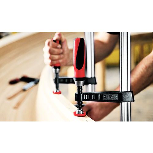 Resistencia garantizada mediante barrilete y guía de fundición. Protecciones de plástico desmontables en las mordazas para piezas frágiles. Rótula con tornillo desmontable e intercambiable sin herramientas ni esfuerzos. Ajuste protegido mediante freno de bloqueo integrado en la guía. Empuñadura bimaterial para optimizar la comodidad de trabajo.