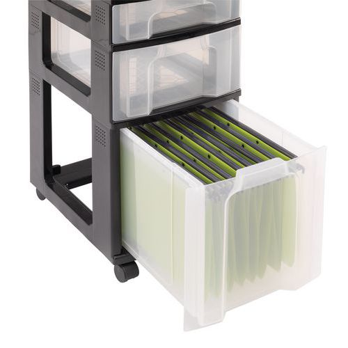 Ladeblok montada sobre 4 ruedas para una capacidad de manejo máxima. Cajones transparentes para una visibilidad mejor del contenido. Herméticos para una protección máxima contra el polvo. Contorno con zonas granuladas en el lateral para un etiquetado fácil.