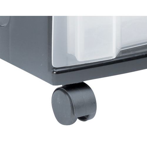 Ladeblok montada sobre 4 ruedas para una capacidad de manejo máxima. Cajones transparentes para una visibilidad mejor del contenido. Herméticos para una protección máxima contra el polvo. Contorno con zonas granuladas en el lateral para un etiquetado fácil.