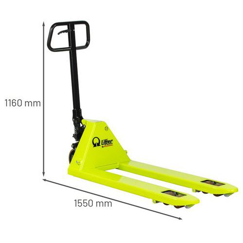 | Nombre del producto | Transpaleta manual ergonómica, Carga: 2500 kg, Longitud Horquilla: 1150 mm, Rueda directriz material: Goma |