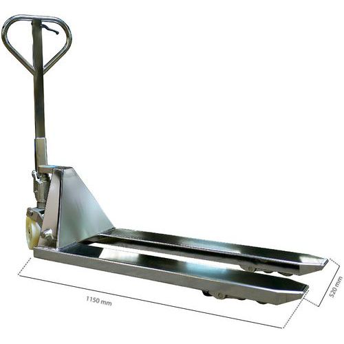 | Nombre del producto | Transpaleta manual para 2,5 T prémium de acero inoxidable 304 con horquillas de 1150 x 520 mm, Carga: 2500 kg |