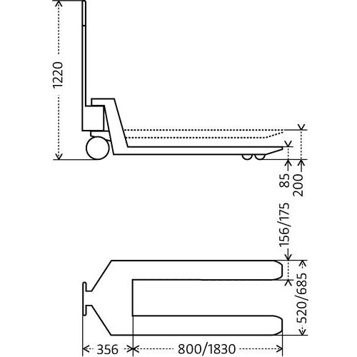 Timón con sistema de elevación automática, 3 posiciones (elevación, punto muerto y bajada) y descenso controlado y sin sacudida de las horquillas.