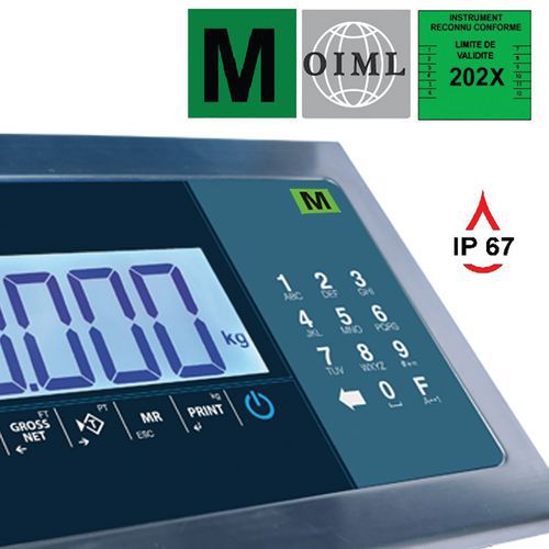 | Funciones | Pesaje, tara, recuento, totalización manual o automática, tabulación directa de la tara, memorización de 5 taras, control +/- con indicación visual (naranja/verde/rojo) y salida RS232. |