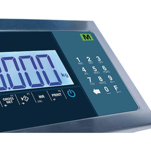 | Funciones | Pesaje, tara, recuento, totalización manual o automática, tabulación directa de la tara, memorización de 5 taras, control +/- con indicación visual (naranja/verde/rojo) y salida RS232. |