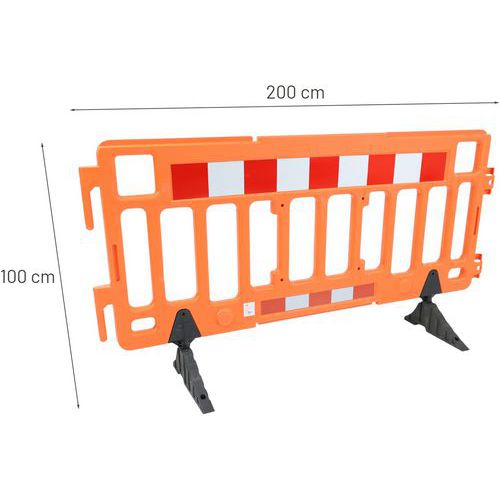 Barrera de seguridad de plástico fácil de transportar. Adecuada para todo tipo de usos urbanos. Cuenta con bandas reflectantes en un lado para una mejor visibilidad. Conexión rápida y sencilla gracias a sus enganches. El material de polietileno hace que la barrera sea resistente a todas las condiciones climáticas.